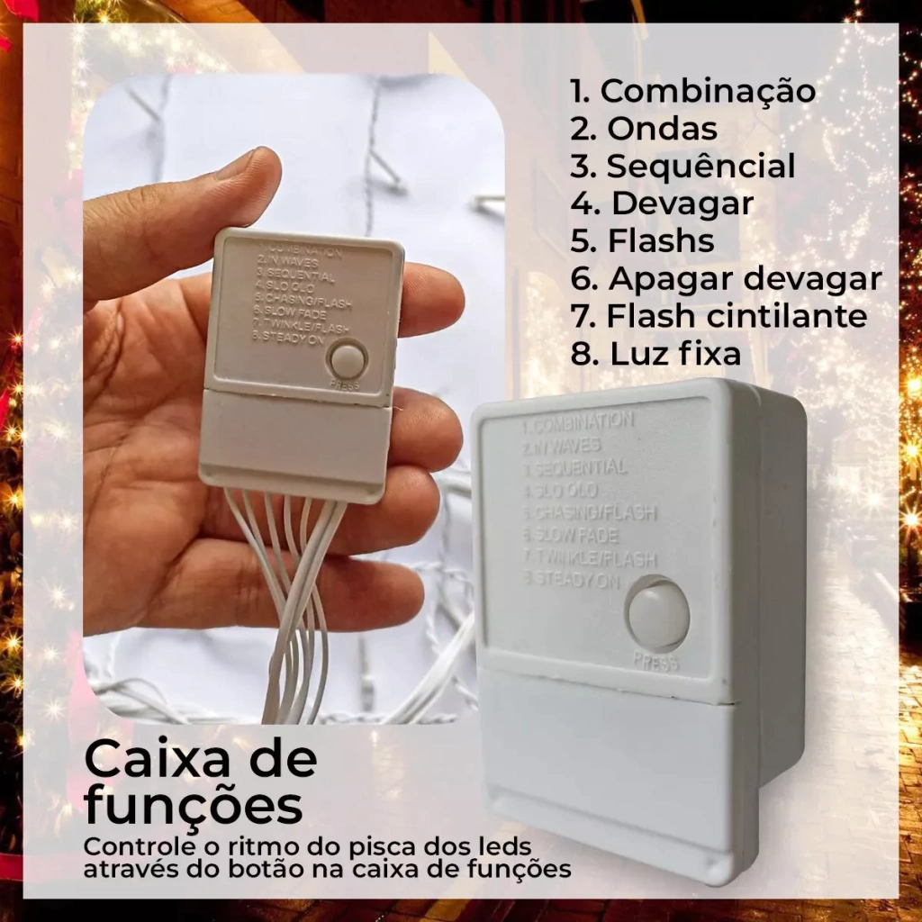 Este produto é recomendado para: Casas, fachadas, lojas, shopping centers, vitrines, etc.CARACTERÍSTICAS:- Código: 11652.- Quantidade de LED: 400.- Modo LED: 8 Funções.- Cor Luz do LED: Azul.- Cor do Fio: Branco.- Voltagem: 127V.- Potência: 6W.- Tomada: Macho e Fêmea.